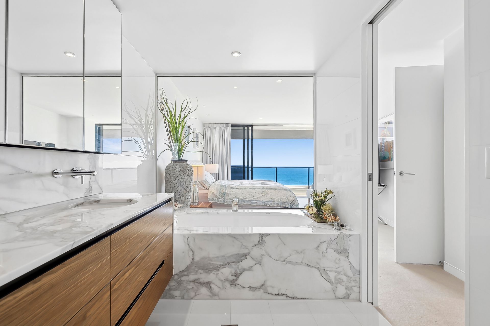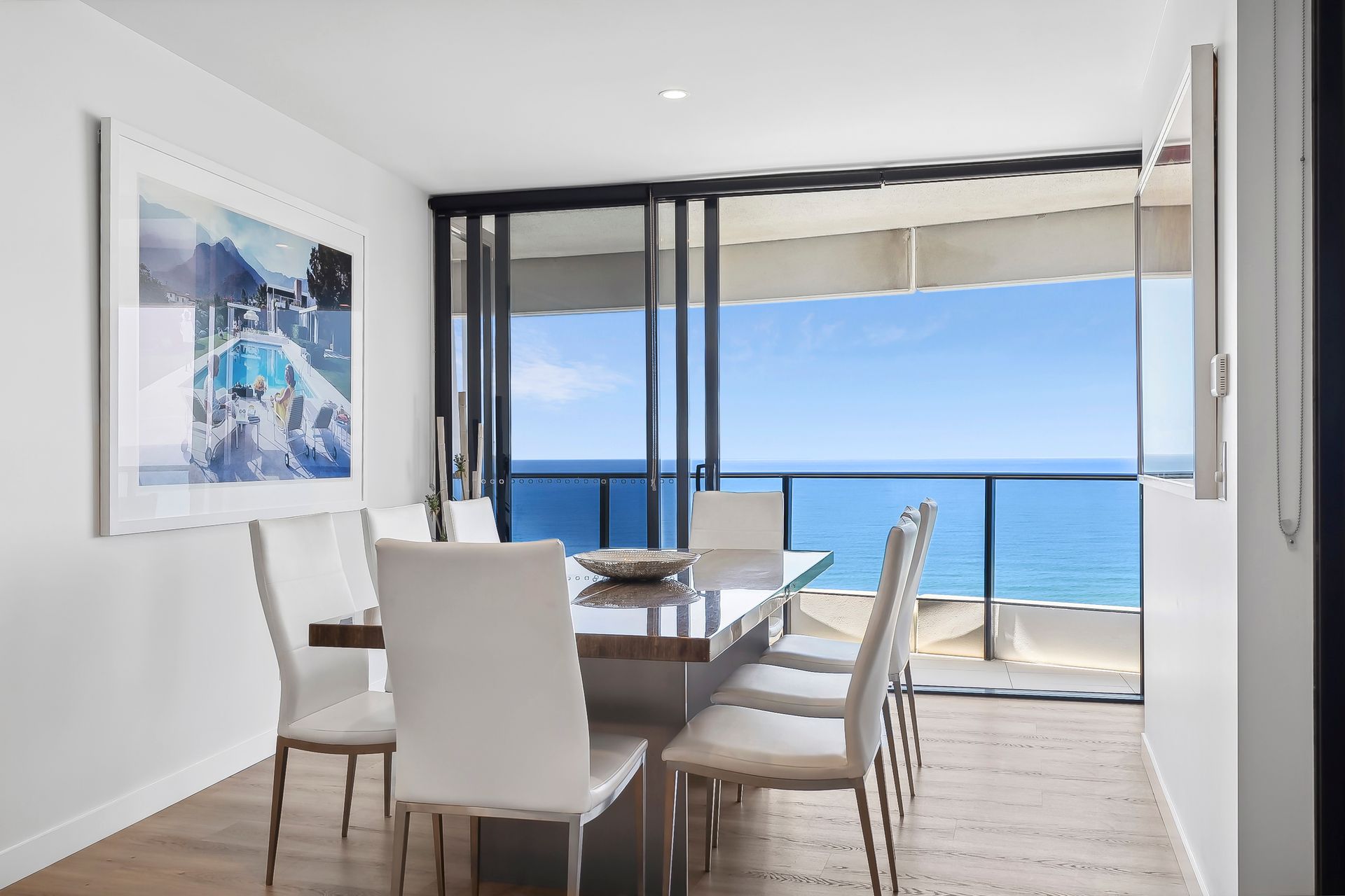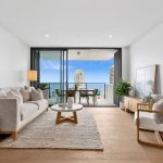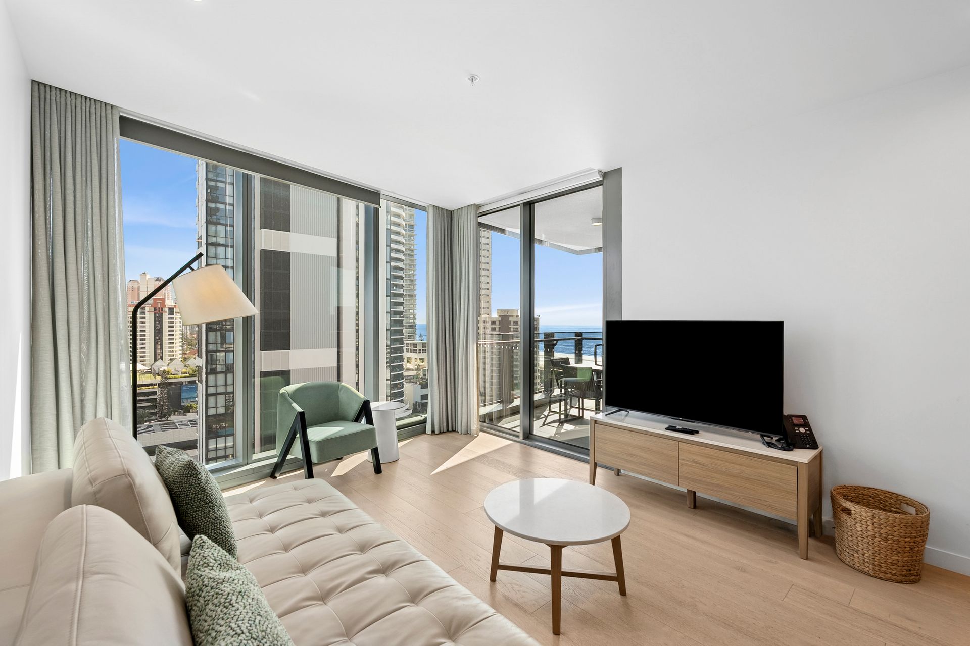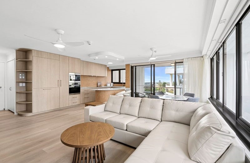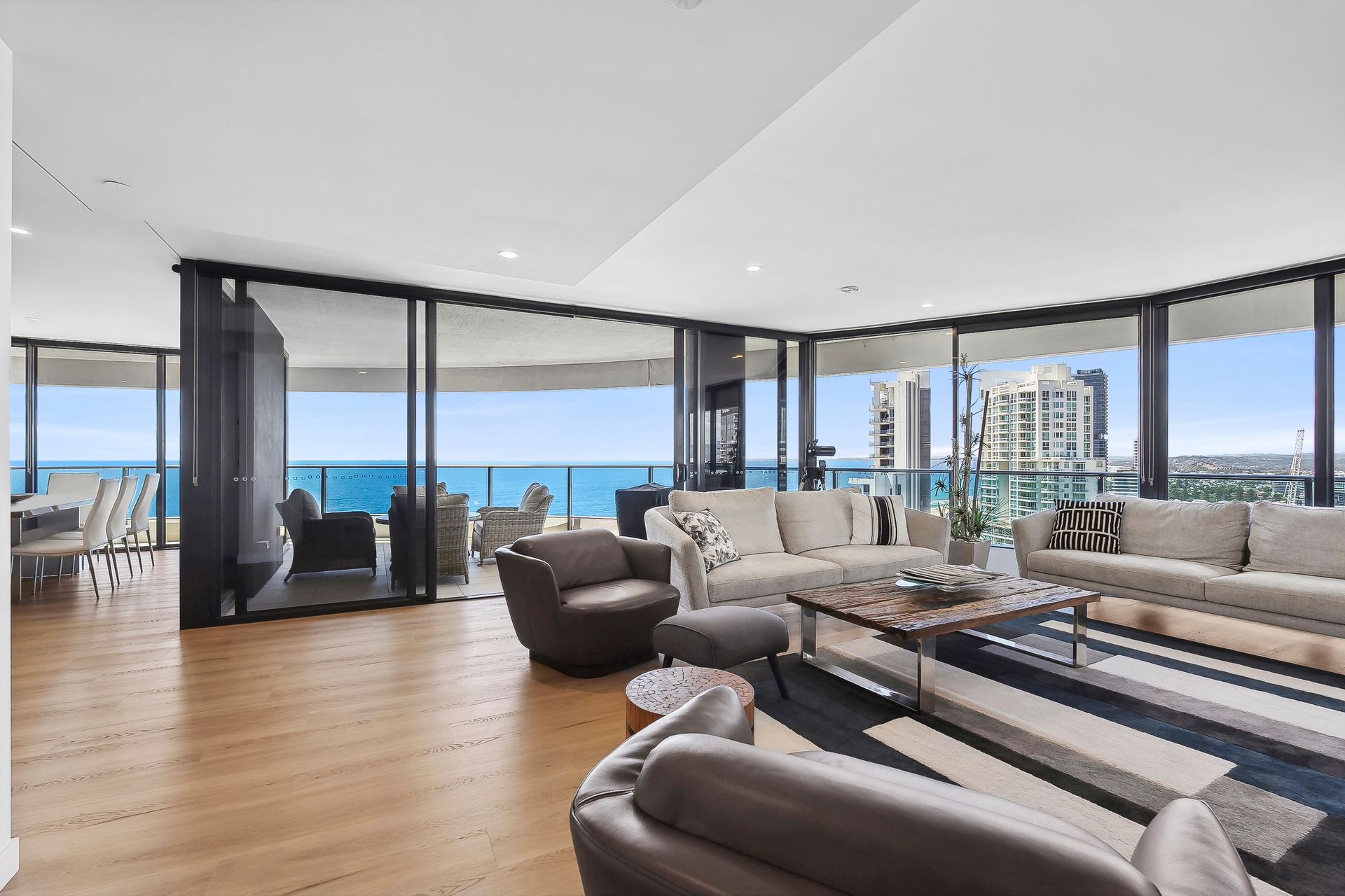 Light-filled open-plan living and private balcony with ocean views