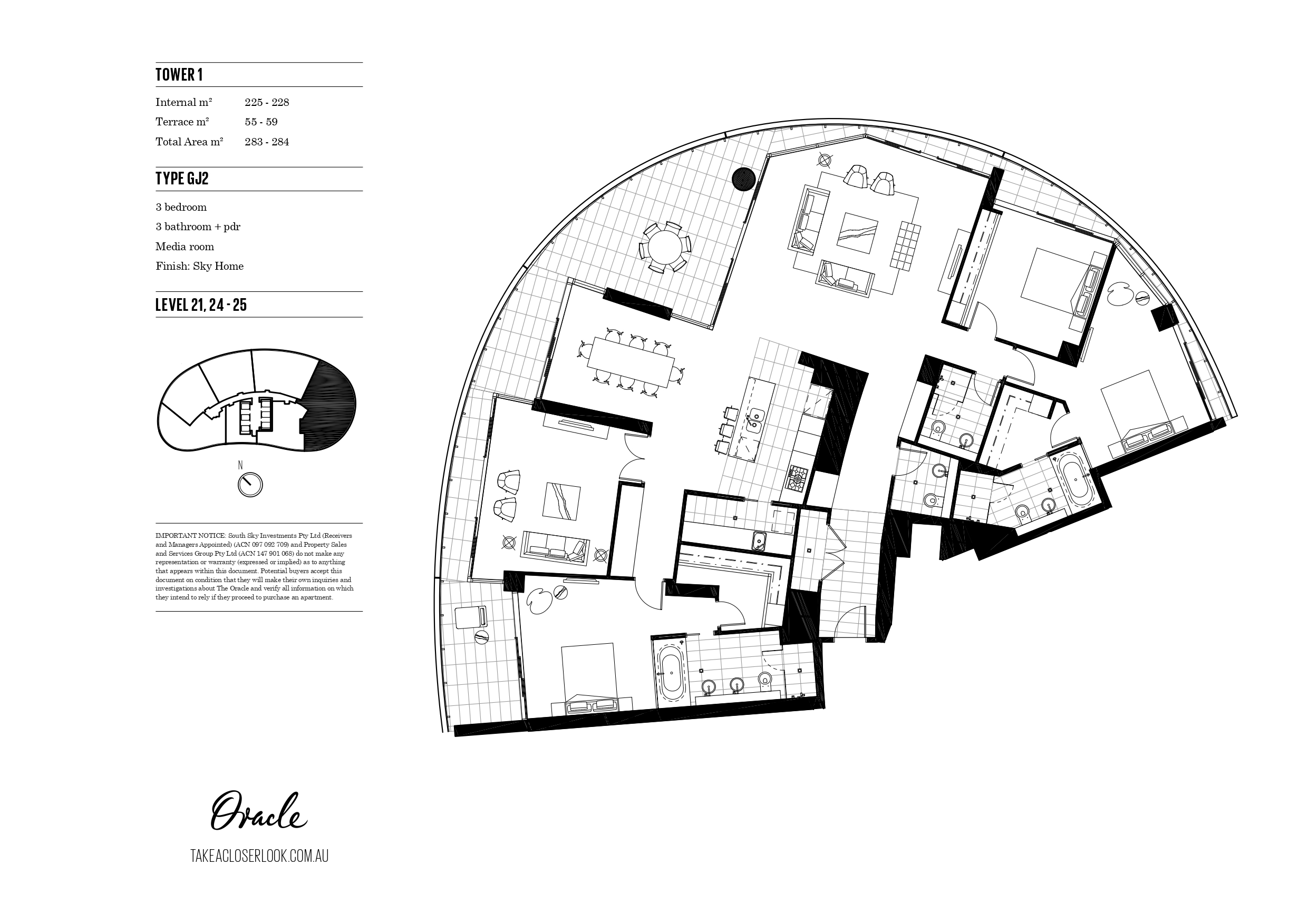 Total area 150sqm, level 52, just 5 apartments per floor 2 Bedrooms, 2 Bathrooms including ensuite with spa bath Large living room with additional study area/TV for kids. The balcony area for this room type, offers the best protection from prevailing southern adverse weather conditions and can be used all year round.